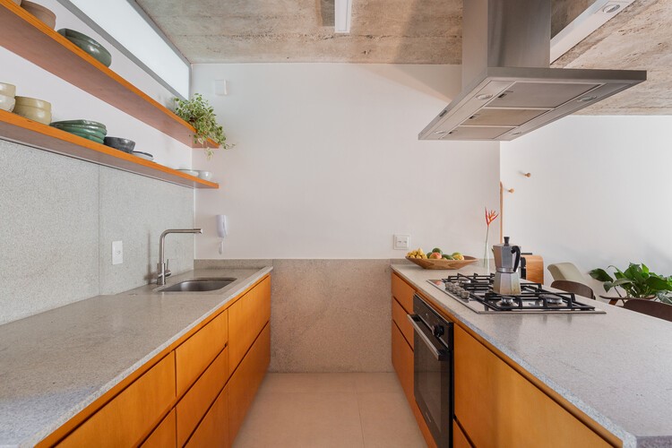 Como o corredor é estreito, os eletrodomésticos principais são divididos entre as duas bancadas para que a circulação seja agrupada em uma única área e seja a menor possível.
