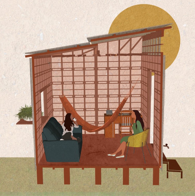 Módulo de Acolhimento Amazônico. Ilustração da Maquete – Casa a partir dos módulos propostos. Crédito dos autores do projeto