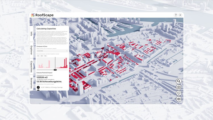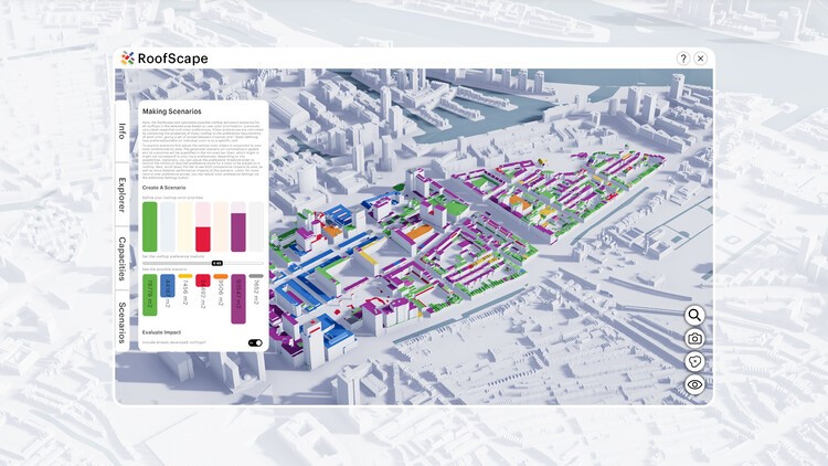 Desenvolvido pela força-tarefa de tecnologia MVRDV NEXT do MVRDV ao lado da Superworld e da prefeitura de Roterdã, o protótipo RoofScape é um mecanismo de visualização para as coberturas de Roterdã.