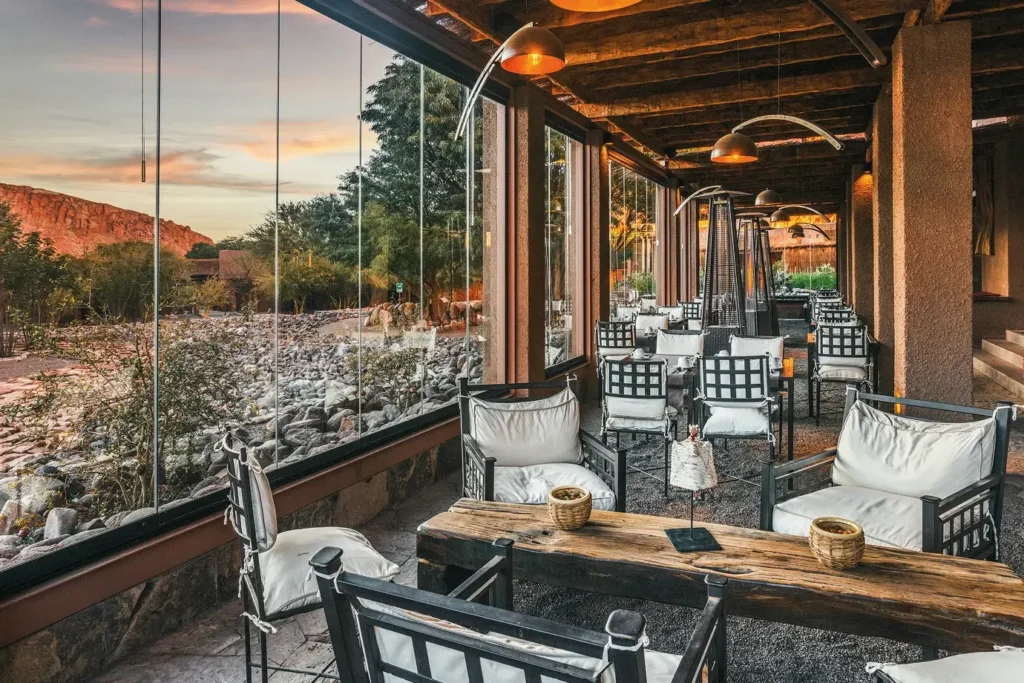 Do lado de fora da hospedagem é difícil perceber onde estão fincados os 42 quartos, que possuem a mesma coloração das montanhas. Mas não se trata de uma experiência rústica. Há duas opções de habitações, de 50 metros quadrados e de 70 metros quadrados, com terraço privativo e vista para a cordilheira, varanda e ducha externa. As áreas comuns incluem uma jacuzzi e seis piscinas, sendo uma aquecida.
