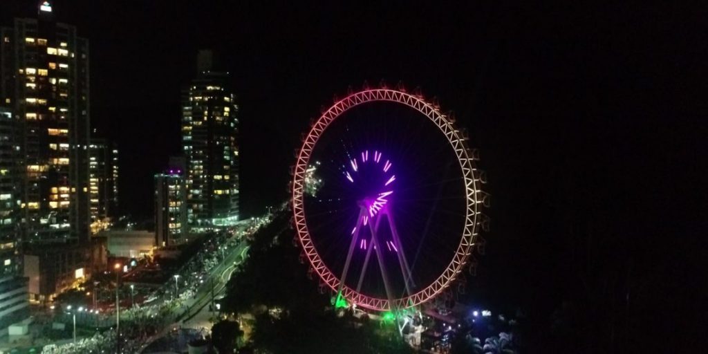Um relógio gigante, considerado o maior do Brasil neste réveillon, projetado com efeitos de luz no aro da maior roda gigante estaiada da América Latina, gerou ainda mais expectativa de quem lotava a praia central.