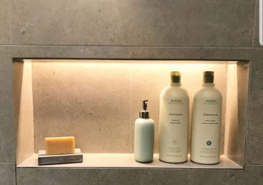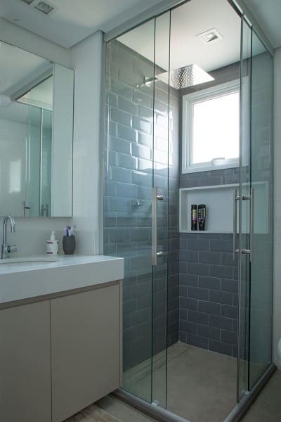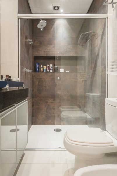 Sendo assim, uma profundidade de 10 cm para o nicho de porcelanato está suficiente para que os produtos sejam apoiados sem cair.