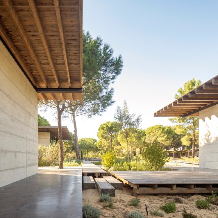 Casa MJA, em Portugal, apresenta uma série de deck soltos no terreno que enaltecem e respeitam o ambiente natural, protegendo o ciclo da água e gerando espaços agradáveis de convivência e circulação.