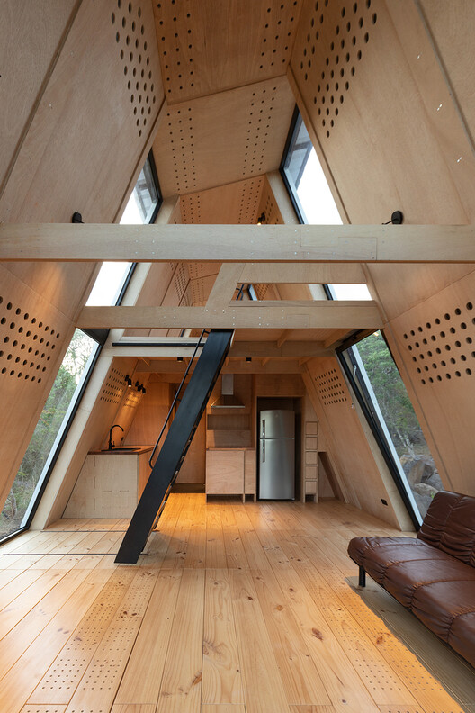“Cinco materiais exclusivos, madeira, pedra, metal, vidro e PVC intervêm de forma pura e proporcional para consolidar um elemento ambientalmente equilibrado. A participação de cada material foi pensada em termos de suas condições de eficiência e flexibilidade. A madeira compensada é o material mais representativo, que foi usado para construir a estrutura, as paredes internas, os móveis e o telhado. A precisão do formato combinada com um processo de corte mecanizado garante a otimização dos recursos.”