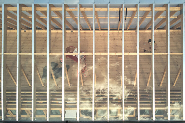 “Para evitar que o espaço interno seja dominado em excesso por princípios estruturais, o material de tensão utilizado é o Hinoki (cipreste japonês) em vez de cabos. Isso criou uma estrutura de madeira que não é muito diferente da usual, exceto pelas vigas curvas e muito planas onde as proporções dos pilares não sustentam o telhado.”