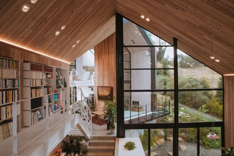 “É uma casa preta em seu exterior e de madeiras claras em toda a superfície interna, buscando contrastes. É um lugar de níveis e alturas duplas, um lugar claro cheio de aberturas com diferentes matizes de cor. Nele, a luz nunca entra na mesma direção, o que permite um jogo de claros e escuros em todo o seu percurso. As fachadas envidraçadas e rotacionadas geram uma transparência transversal em toda a casa.”