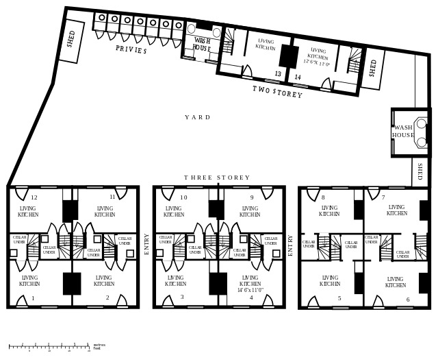 Segundo o livro Urban Forms, the death and life of the urban block o centro gerou espaços posteriores privados para a habitação térrea que, em conjunto, formaram um pátio, acessível a partir da rua através de uma passagem controlada.