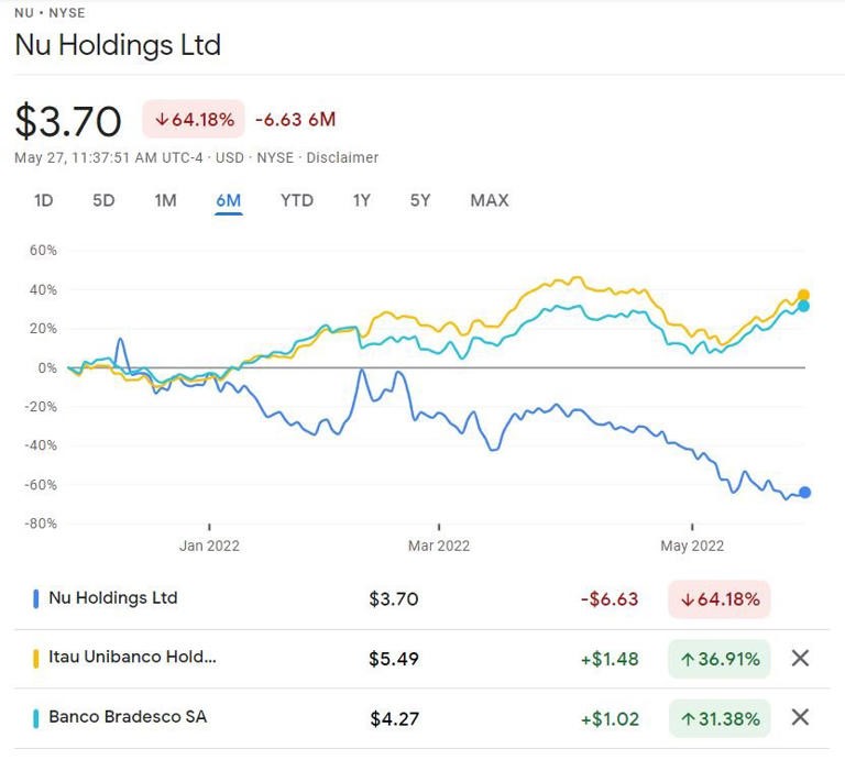 Às 12h30 de Brasília do último dia 27/5, as ações do Nubank estavam em alta, negociadas US$ 3,70.
