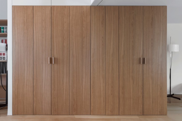 Essas portas ocultas também são projetadas como painéis dobráveis, embora, devido ao espaço mais aberto, elas se projetem perpendicularmente à parede.