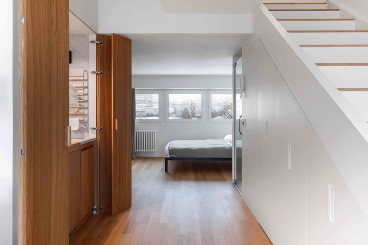 Por exemplo, em um apartamento de 33 m2 do Studio Bazi, os arquitetos trabalharam com espaço limitado para redesenhar completamente o apartamento compacto de um cliente.