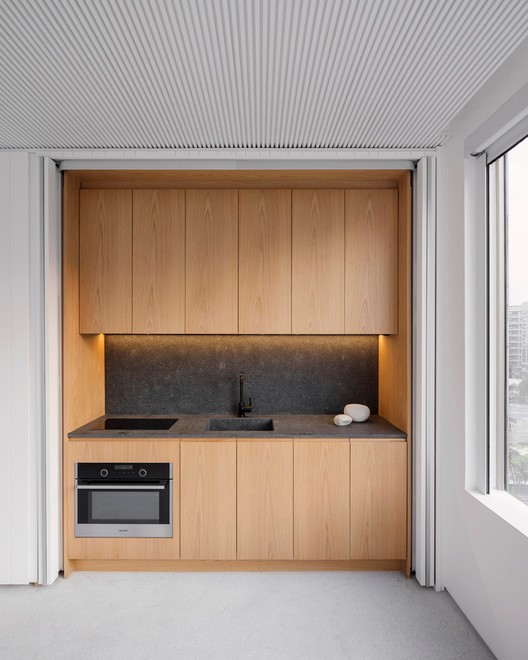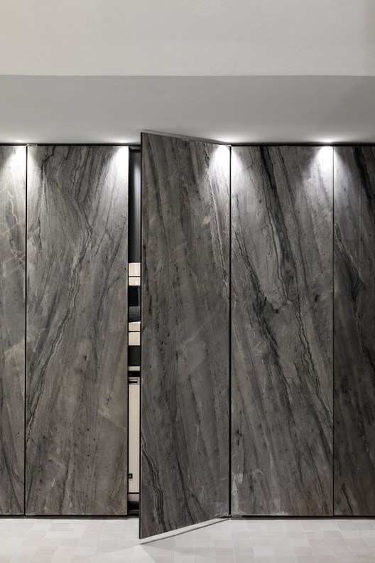 Ao ocultar os utensílios da cozinha por trás dessas portas rígidas, mas bonitas, as linhas minimalistas e modernistas da estética mais ampla da estrutura são mantidas. Essas portas abrem como portas de armário normais, em vez de painéis deslizantes ou dobráveis.