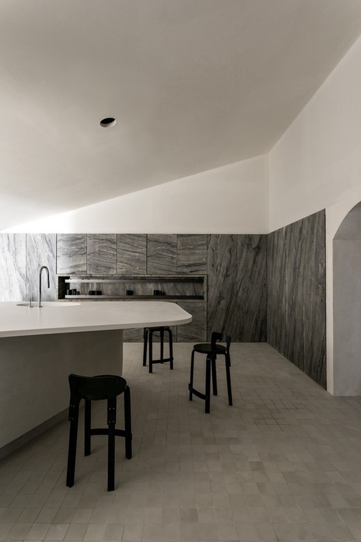 Outro exemplo impressionante de uma cozinha oculta maior é a Cozinha de Pedra de Felipe Hess Arquitetos, que se estende pelos quatro lados de uma grande sala e circunda uma ilha de cozinha biomórfica central.