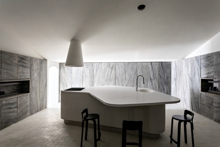 Escondida atrás de portas de armário revestidas de mármore cinza, a materialidade e a geometria da cozinha contrastam com as formas curvilíneas e o acabamento branco da ilha, paredes, teto e entrada.