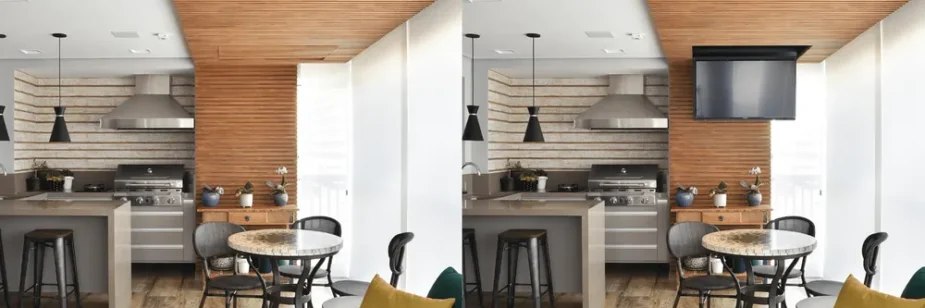 Nesse projeto assinado pela arquiteta Rosangela Pena, não havia uma parede livre e ideal para inserir a televisão de forma que pudesse ser vista por quem está na bancada. Portanto, optar pela TV Flap foi a solução ideal.