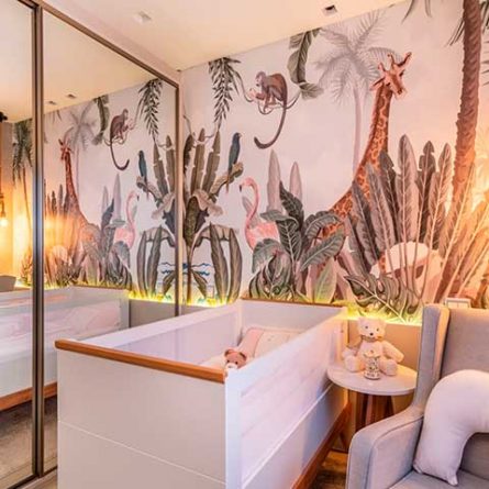 O safari é moderno e chique, as cores claras trazem tranquilidade e o verde remete ao meio ambiente, estabelecendo uma conexão do bebê com a natureza. O destaque nesse projeto foi a escolha do papel de parede, que criou a identidade desse cantinho especial, o pendente com cordas se encaixou com o estilo escolhido e ofereceu uma iluminação indireta e confortável. Prateleiras também são uma ótima opção para quartos infantis, versáteis e fundamentais para organização, e ainda ajudam a manter os objetos importantes sempre à mão.