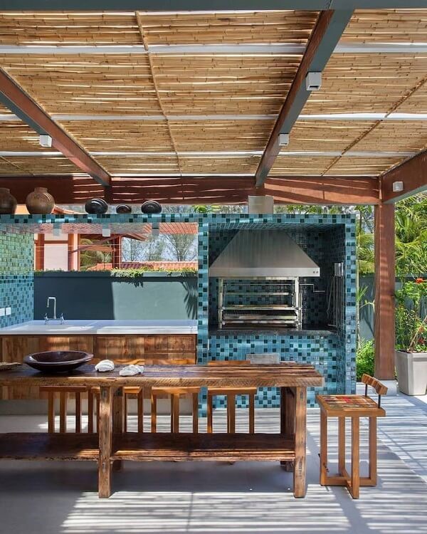 1. O revestimento para churrasqueira feito em pastilhas azuis trazem um toque de cor para o ambiente. Fonte: Estudio Barino