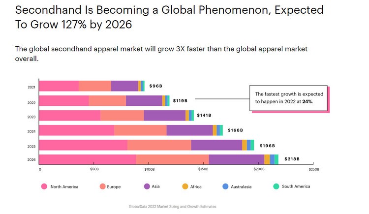 Segundo dados do site de revenda de roupas Threadup, o mercado de segunda mão está se tornando um fenômeno global, com expectativa de crescimento de 127% até 2026 e o mercado global de vestuário de segunda mão crescerá 3 vezes mais rápido do que o mercado global de vestuário em geral.