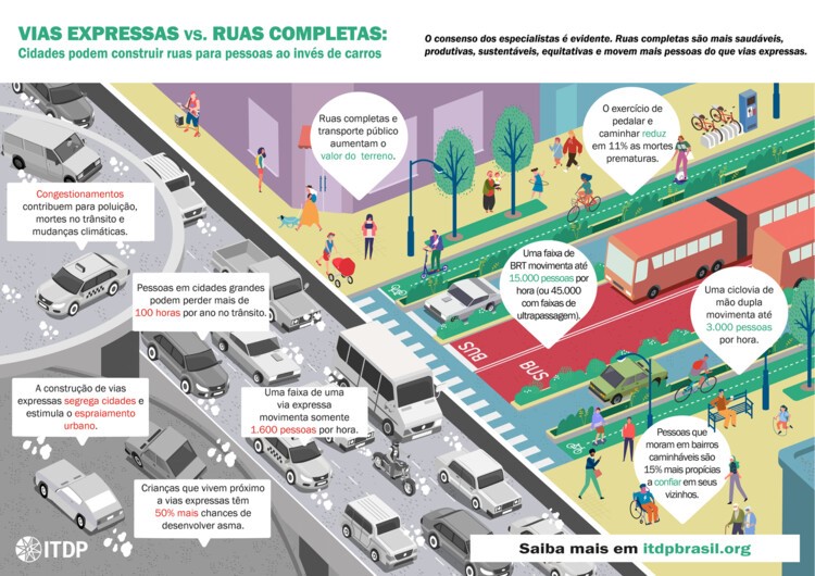 Para contribuir com o tema, o Instituto de Políticas de Transporte & Desenvolvimento (IPTD) produziu o material Vias Expressas vs. Ruas Completas, com o objetivo de comparar ambas em termos de saúde, eficiência, habitação e qualidade ambiental e de vida.