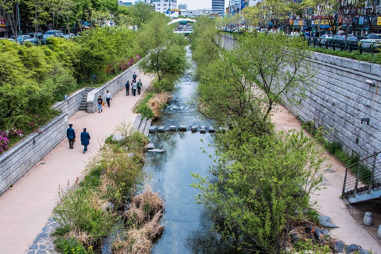 A elevada Cheonggye Freeway, em Seul, Coreia do Sul, foi demolida criando um espaço verde de 9 km que melhorou a qualidade de vida local e estimulou a demolição de outras 15 vias expressas. Foto: Ted McGrath