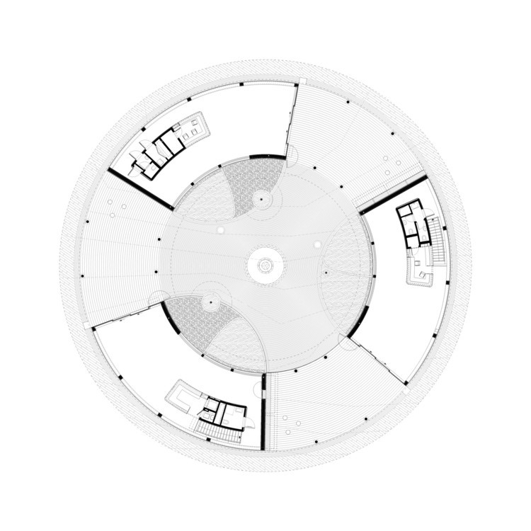 Esses projetos são guiados por uma geometria de organização forte, e a forma circular é absolutamente formativa para a experiência de cada espaço interior.