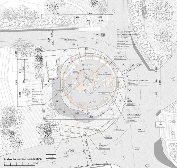 Enquanto isso, em seu design exclusivo para Himitsujanai Kichi, Itsuki Matsumoto e Ehime Architecture brincam neste design de interior radial compensando o “centro”, permitindo que a área do visitante tenha um espaço maior para se abrir para a paisagem circundante.