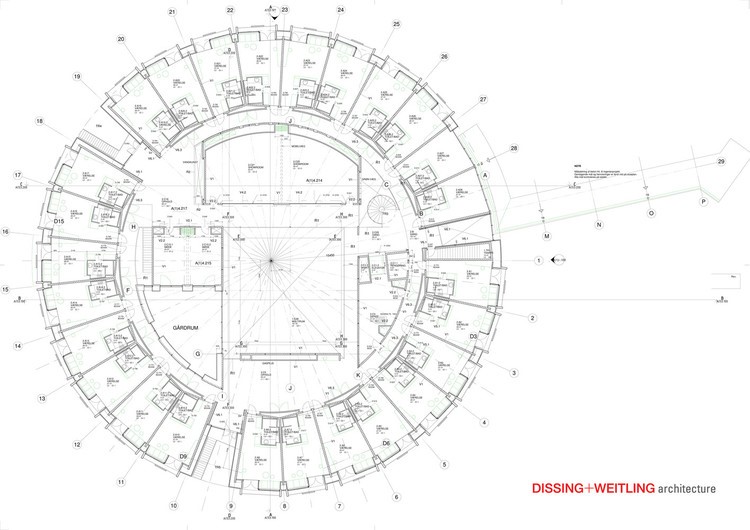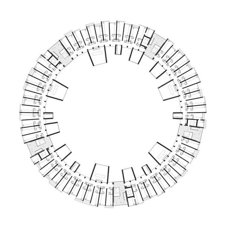 Da mesma forma, Lundgaard and Trandberg Architects ‘Tietgen Dormitory organiza os dormitórios radialmente, deixando o centro do círculo aberto em um belo pátio para os alunos se reunirem.