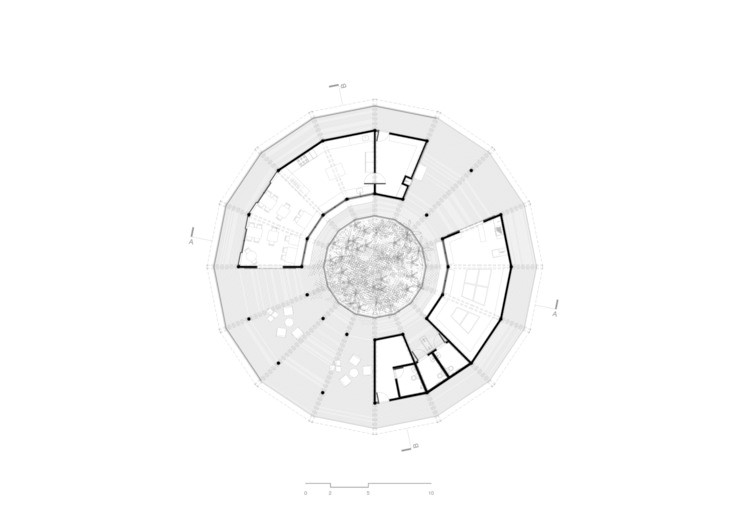 Nestes casos, o design interior ortogonal fornece a disposição mais limpa e eficiente, ao mesmo tempo que respeita a estética do plano circular.