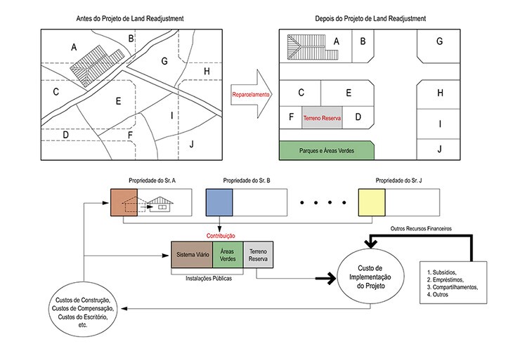 Em outras palavras, por meio de projetos de land readjustment, a principal contribuição é na forma de terrenos que vão melhorar os espaços públicos — sistema viário, parques, calçadas e outros equipamentos públicos — e, consequentemente, valorizar o preço das propriedades privadas.