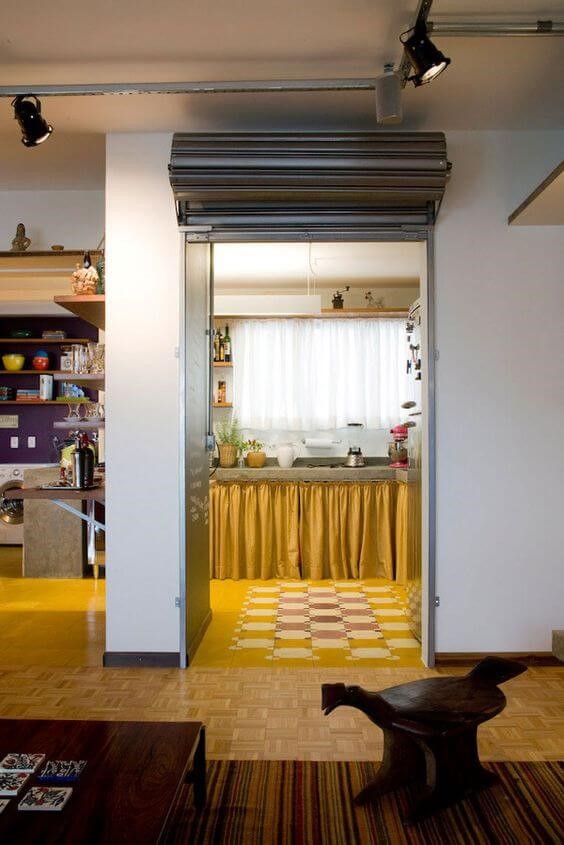 Na imagem abaixo, observe que a porta de aço de enrolar além de separar a cozinha da sala de estar, a peça também conversa diretamente com a estrutura metálica dos spots de luz do ambiente.
