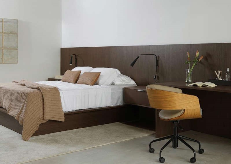 No projeto assinado pela arquiteta Ticiane Lima para a Criare Ideal Home, em Perdizes, na capital paulista, a bancada segue o mesmo padrão amadeirado Nocê Sevilha na cabeceira e na cama de casal, de forma inteligente e minimalista.