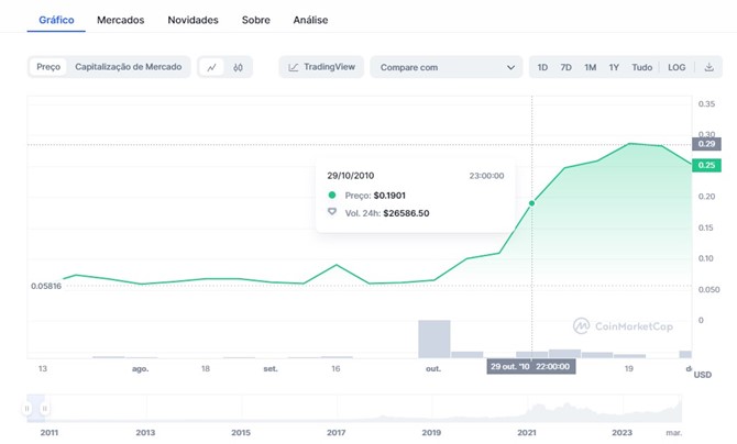 Segundo dados do CoinMarketCap, cada BTC era negociado entre US$ 0,06 e US$ 0,28 no 4º trimestre de 2010.