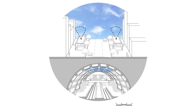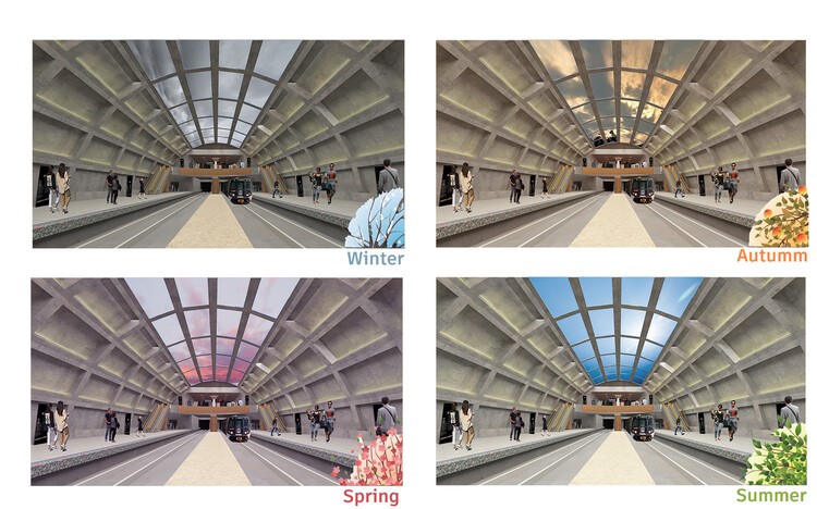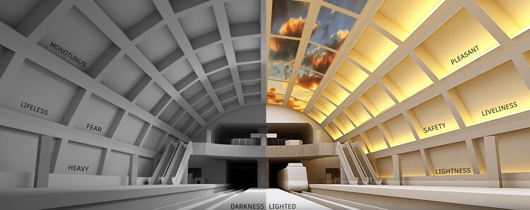 – Para acabar com as sensações negativas de estar no subsolo e fazer com que a população participe da dinâmica da natureza, foi pensado em um meio de trazer a paisagem de fora em tempo real através de painéis iluminados que transmitem o decorrer do dia e do ano (incluindo as estações), captados por câmeras externas instaladas na superfície da entrada das estações, promovendo, assim, conforto, acolhimento, segurança para todos os cidadãos -.
