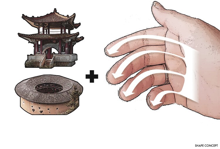 Para o desenvolvimento da volumetria do edifício, o Coletivo inspirou-se em um gesto de mão convidativa e semiaberta, e na hakka architecture, um estilo arquitetônico característico da região chinesa.