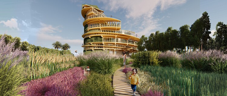 A proposta de uma fazenda vertical icônica em madeira abriga cultura, lazer e toda a cadeia de produção e distribuição alimentar.