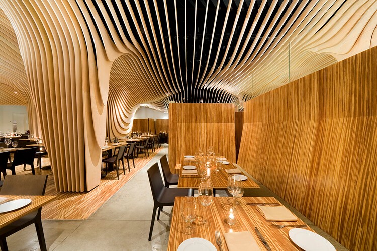 O projeto do Restaurante BANQ / NADAAA, por exemplo, apresenta um forro de madeira escultórico que dá identidade ao projeto, ao mesmo tempo que esconde os elementos acústicos e sistemas de ventilação do restaurante.