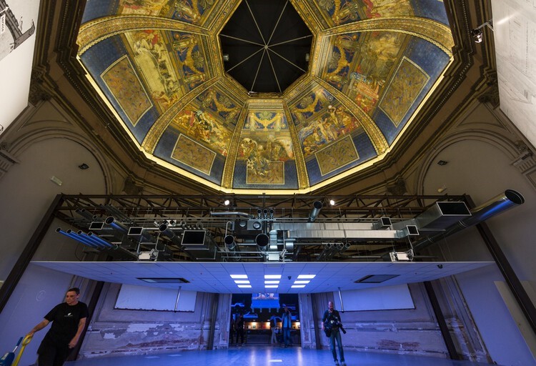 Enquanto na representação renascentista vemos uma forma mais orgânica e uma pintura remetendo aos afrescos italianas, o forro contemporâneo se apresenta como uma camada construtiva que esconde todo um aparato de tubulações e dutos dos sistemas que foram sendo somados à arquitetura com o passar do tempo.