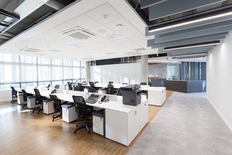 Buscando resguardar espaços de trabalho que tenham qualidade, e portanto, controle tanto de ventilação quanto acústico, os forros foram empregados estrategicamente.