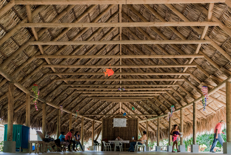 Como resultado de um concurso público, o projeto mesclou técnicas vernaculares (estrutura de madeira e telhado de palha) com métodos contemporâneos (base elevada em concreto) para oferecer uma estrutura resistente à elevação da água.