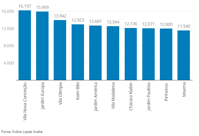 O preço médio no local é de R$ 16.197 por metro quadrado, ou seja, um apartamento de 100 metros quadrados custa em torno de R$ 1, 62 milhão. Em seguida no ranking, aparecem os bairros Jardim Europa (com R$ 15.909) e Vila Olímpia (com R$ 13.942).