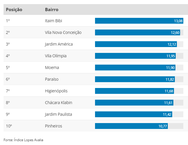 Já no que se refere ao valor de condomínio o bairro mais caro de São Paulo é o Itaim Bibi, com média de R$ 13,08 por metro quadrado, seguido pela Vila Nova Conceição (R$ 12,60) e Jardim América (R$ 12,12).