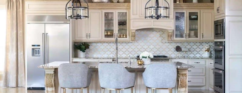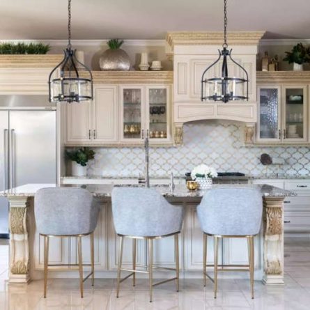 Se você tem tetos altos, pode ser difícil encontrar objetos de decoração que sejam altos o suficiente para preencher o espaço acima dos armários da cozinha e trabalhar perfeitamente com o resto do estilo do ambiente.