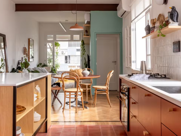 Com tons terrosos predominantes, cozinha ganha ainda mais encanto com luz natural das janelas amplas no apartamento em Laranjeiras, Rio de Janeiro — Foto: André Nazareth