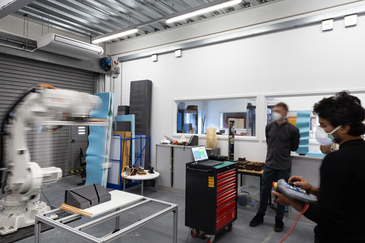 Usando um braço robótico de 6 eixos, o modelo digital gerou toolpaths para fabricar os moldes das peças em que, após a cura e a varredura em 3D, quaisquer desvios nos componentes foram incorporados de volta ao modelo digital.