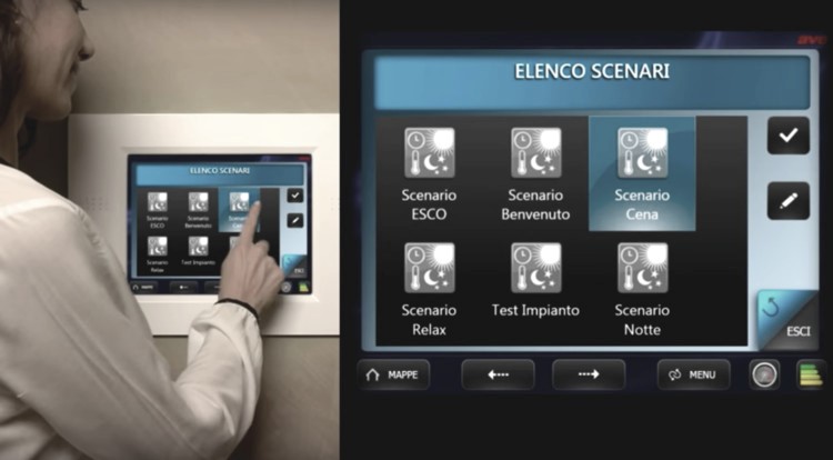 Por exemplo, ao selecionar um ambiente predefinido para a noite, o sistema executará, em um único processo, a atenuação e o desligamento das luzes, o fechamento das cortinas e a ativação do alarme.