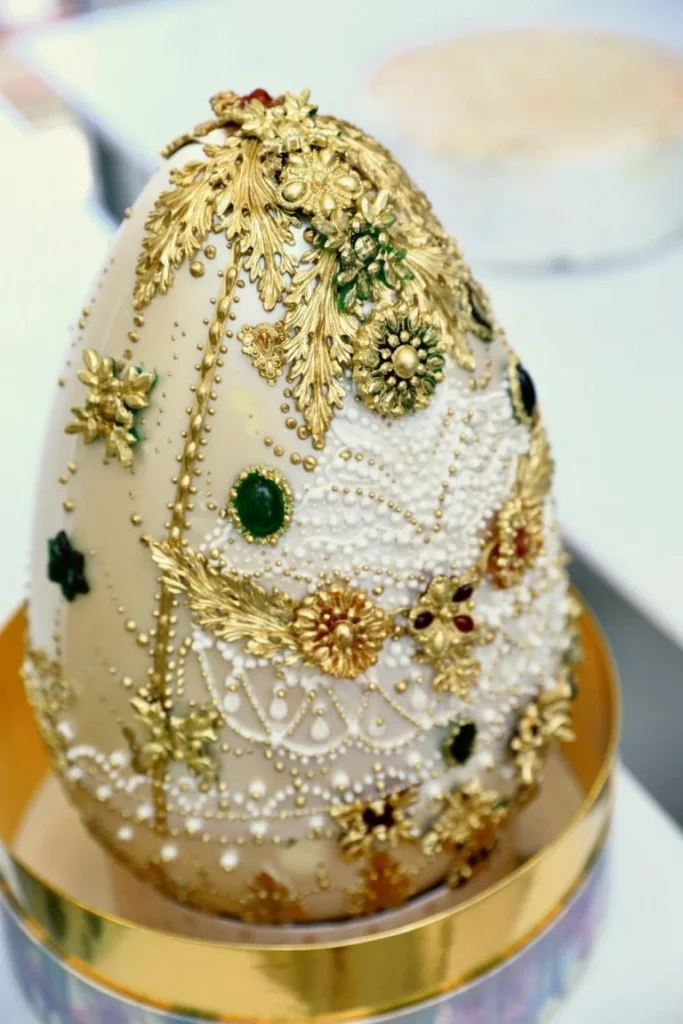 Referência aos icônicos ovos russos da era imperial, o Fabergé Richesse traz ganache de caramelo, praliné de amêndoas e avelã, além de brigadeiro meio amargo. A estética tem acabamento sofisticado.