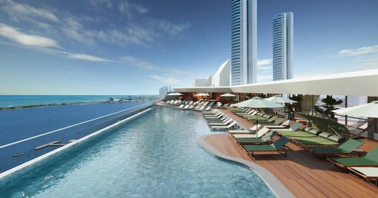Hotel dispõe de rooftop com piscina com borda infinita, além de spa, academia e salas de reuniões