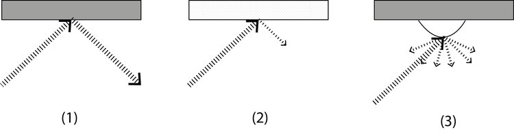 Tipos de superfícies: (1) Reflexiva / (2) Absortiva / (3) Difusora
