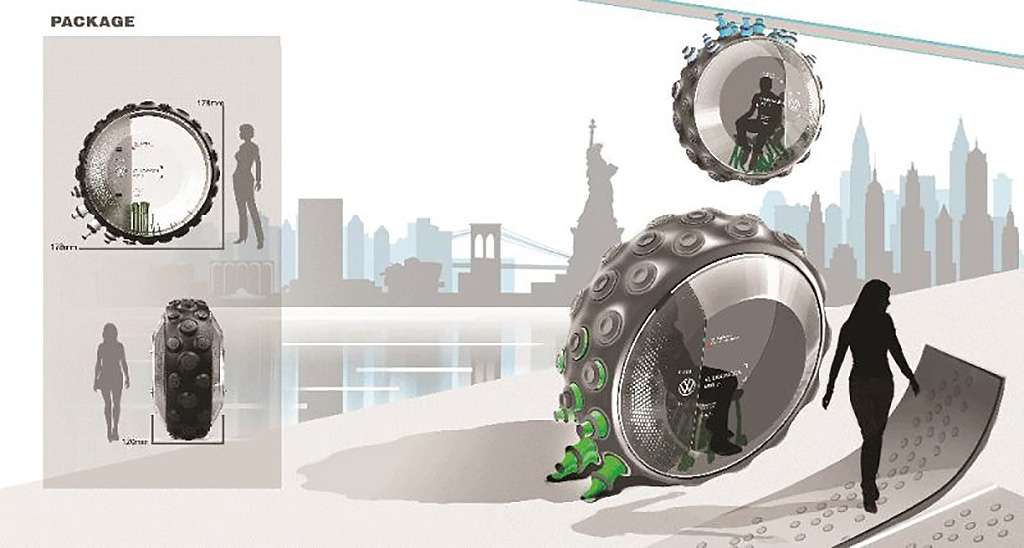 O veículo serve não apenas como meio de locomoção, interligado a uma futura rede de mobilidade aérea, em cabos, mas também, como um mobiliário urbano, já que sua estrutura permite que ele possua várias funções.