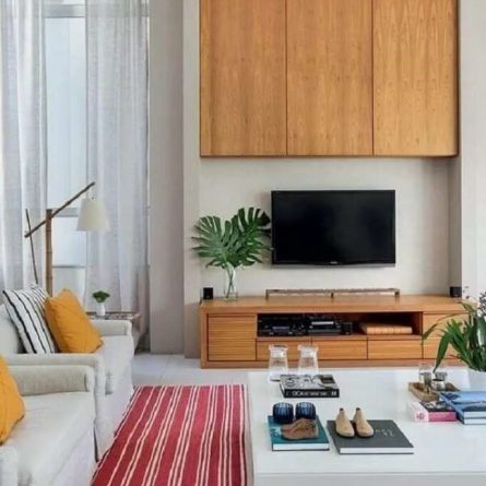 O rack suspenso é uma ótima alternativa para salas pequenas, pois além da sua estrutura servir de apoio para televisão e demais objetos decorativos, seu espaço interno pode ajudar na organização do cômodo, enquanto que a parte debaixo do móvel pode acomodar puff para sala ou até mesmo um revisteiro.
