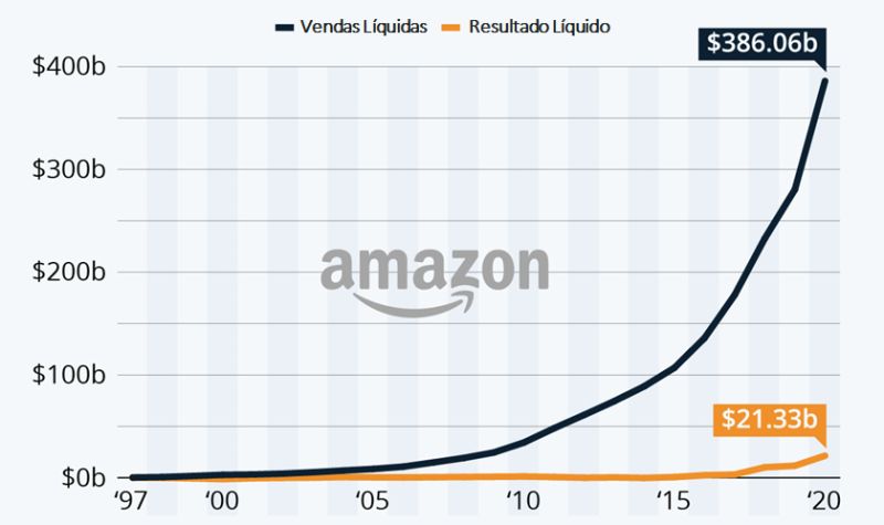 Em 2020 a Amazon faturou US$ 386 bilhões, com lucro líquido do período crescendo 84% em relação ao ano anterior.